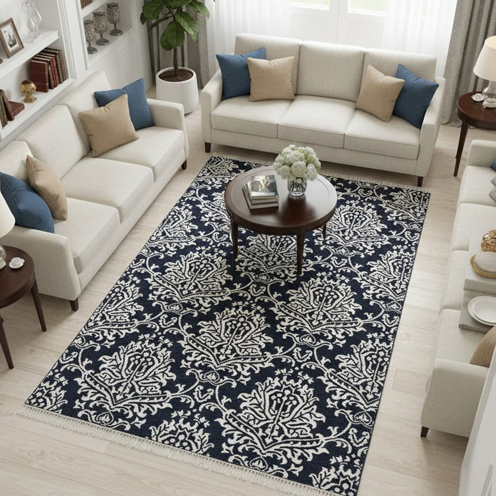 - Pattern: Features an intricate central floral medallion and complementary scrollwork/vines throughout.